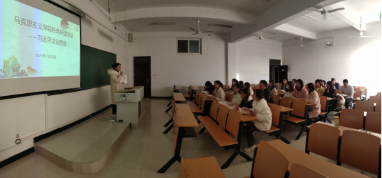 在第二阶段的活动中,朱新荣院长介绍和分享了《习近平谈治国理政》精彩章节--建设法治中国的研读体会,并与现场的青年教师进行了研讨交流,使全体教师共同感受中国法治发展的辉煌成就。