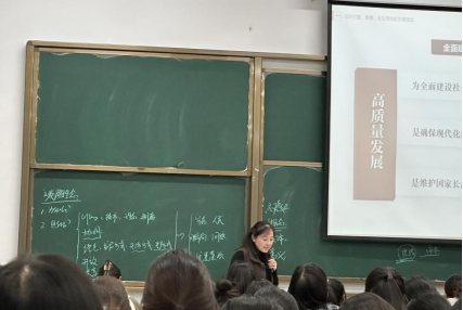 朱新荣副教授主要讲授习近平新时代中国特色社会主义思想概论课的第六章“推动高质量发展”。通过巧妙的教学设计,生动的案例讲解,严谨的板书设计,以及互动性强的课堂活动,引导学生积极思考,启发他们的创新思维。几位青年教师深入到朱新荣副教授的课堂中,认真聆听、仔细记录,在观察中吸取教学方法的精髓。