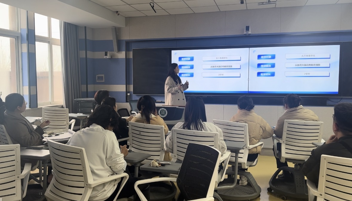 第一阶段由时玉壮老师和马春艳老师以《从教育大国迈向教育强国》为题进行示范性讲课和说课。时老师以《教育强国建设规划纲要(2024-2025)》为教学载体,结合2025年两会提出的“基础教育扩优提质”“人工智能+教育”等热点议题,依托深厚的政策解读能力与教学智慧,将宏观战略转化为生动案例,实现政策理论的生活化阐释。马春艳老师从教学目标、教学重难点、教学方法与策略等方面进行了说课。马老师指出,本节课的教学旨在帮助学生们深入理解教育强国的内涵与意义,掌握从教育大国迈向教育强国的关键路径。马老师的说课逻辑清晰、层次分明,起到了良好的示范效果。