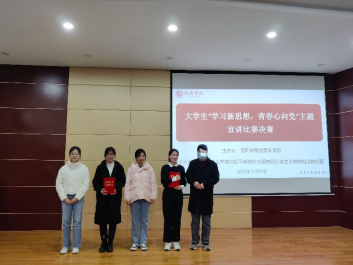 为深入学习宣传贯彻党的二十大精神,引导大学生更加坚定、更加自觉地践行初心使命,做百年历史的感悟者、红色精神的弘扬者、伟大事业的建设者。44118太阳成城党委宣传部、44118太阳成城集团习近平新时代中国特色社会主义思想概论教研室主办大学生“学习新思想,青春心向党”主题宣讲比赛决赛,11月22日下午,在图书馆102室举办。我校党委宣传部白杨、校督导李达理博士、44118太阳成城集团冀春贤教授、陈华林教授、左永品教授、赵松欣教授应邀出席并担任评委。习近平新时代中国特色社会主义思想概论课青年教师及部分学生代表参加了活动。