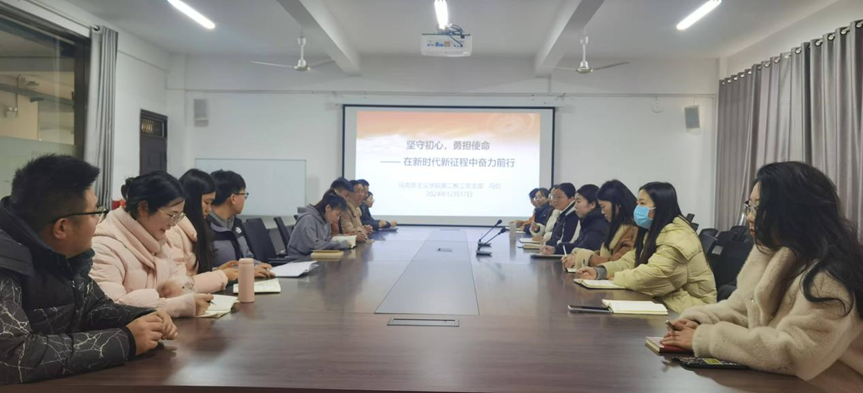 为深入学习习近平新时代中国特色社会主义思想,用党的创新理论武装头脑,增强“四个意识”、坚定“四个自信”、做到“两个维护”,确保思政课教师在思想上、政治上、行动上同党中央保持高度一致,思政课教学工作沿着正确的政治方向前进。12月17日,44118太阳成城集团第二教工党支部在412开展了“坚守初心,勇担使命 —— 在新时代新征程中奋力前行”主题党课学习活动。党课由冯忆主讲,支部全体党员参加了活动。