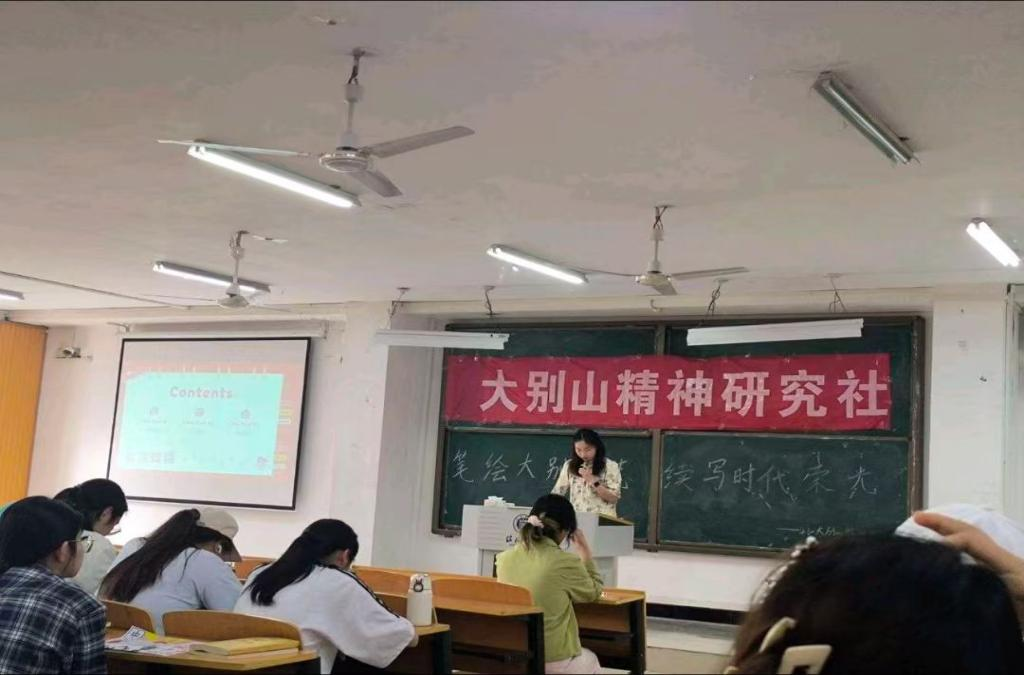 参赛选手们提前提交了原创手抄报作品以及海报作品,活动当天他们在现场通过PPT或者短视频的方式讲述他们的作品,分享创作灵感、阐释创作理念。选手们结合历史故事与当代视角,以生动的语言和精美的画面诠释大别山精神的现实意义。现场社团成员们认真聆听,积极交流。