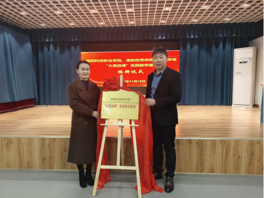 在热烈的掌声中,陈金强与方婷婷共同为“信阳科技职业学院‘大思政课’实践教学基地”揭牌。