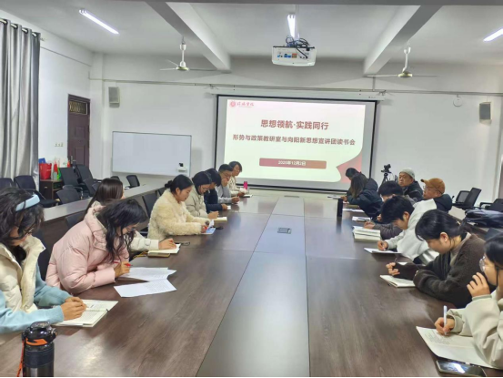 思想领航,实践同行。为推动《习近平谈治国理政》第五卷学习走深走实,12月2日下午,形势与政策教研室联合向阳新思想宣讲团,在人文楼南楼412会议室共同举办专题读书会。院党总支书记陈金强、李达理博士、郭世杰博士、形势与政策课全体任课教师及向阳新思想宣讲团学生代表参加本次学习活动,共学共进。读书活动由刘惠文主持。